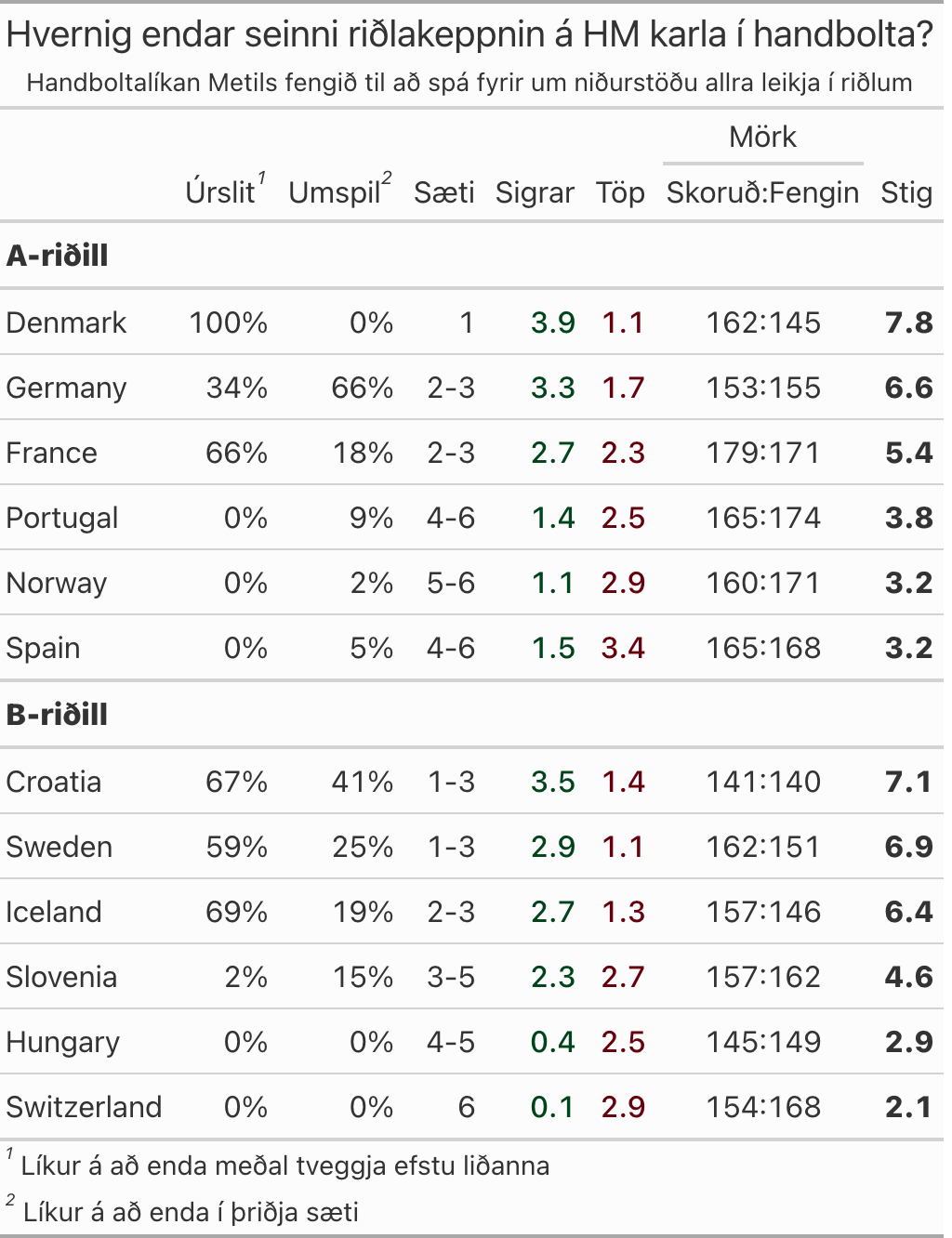 Fyrir fyrsta leik mótsins var handboltalíkanið fengið til að spá fyrir um alla leiki riðlanna og spárnar notaðar til að reikna hvernig riðlarnir myndu fara. Við sjáum að spárnar hafa gengið ágætlega.