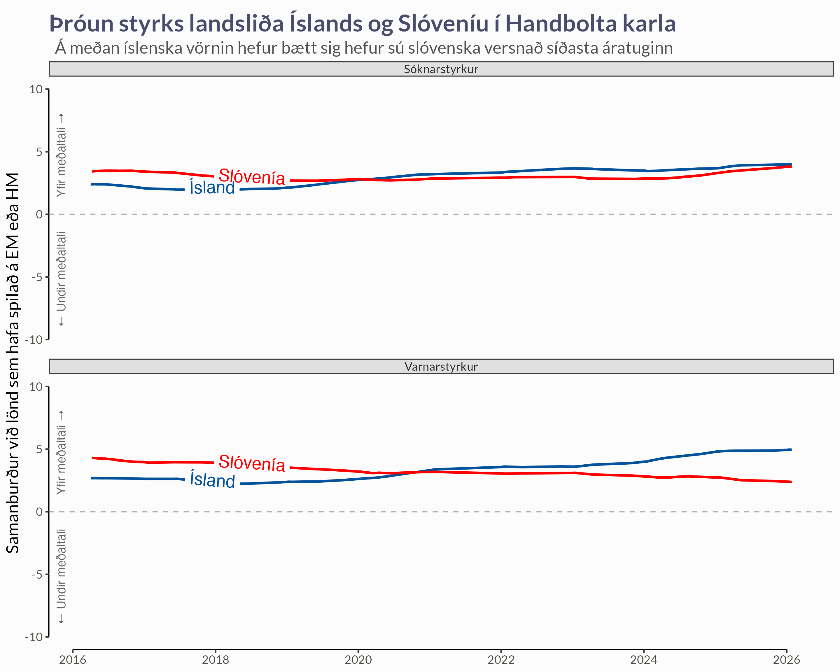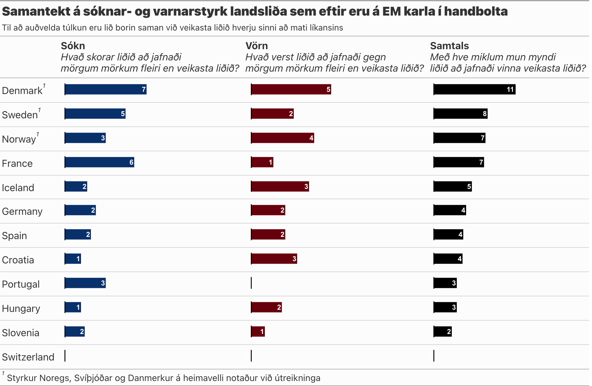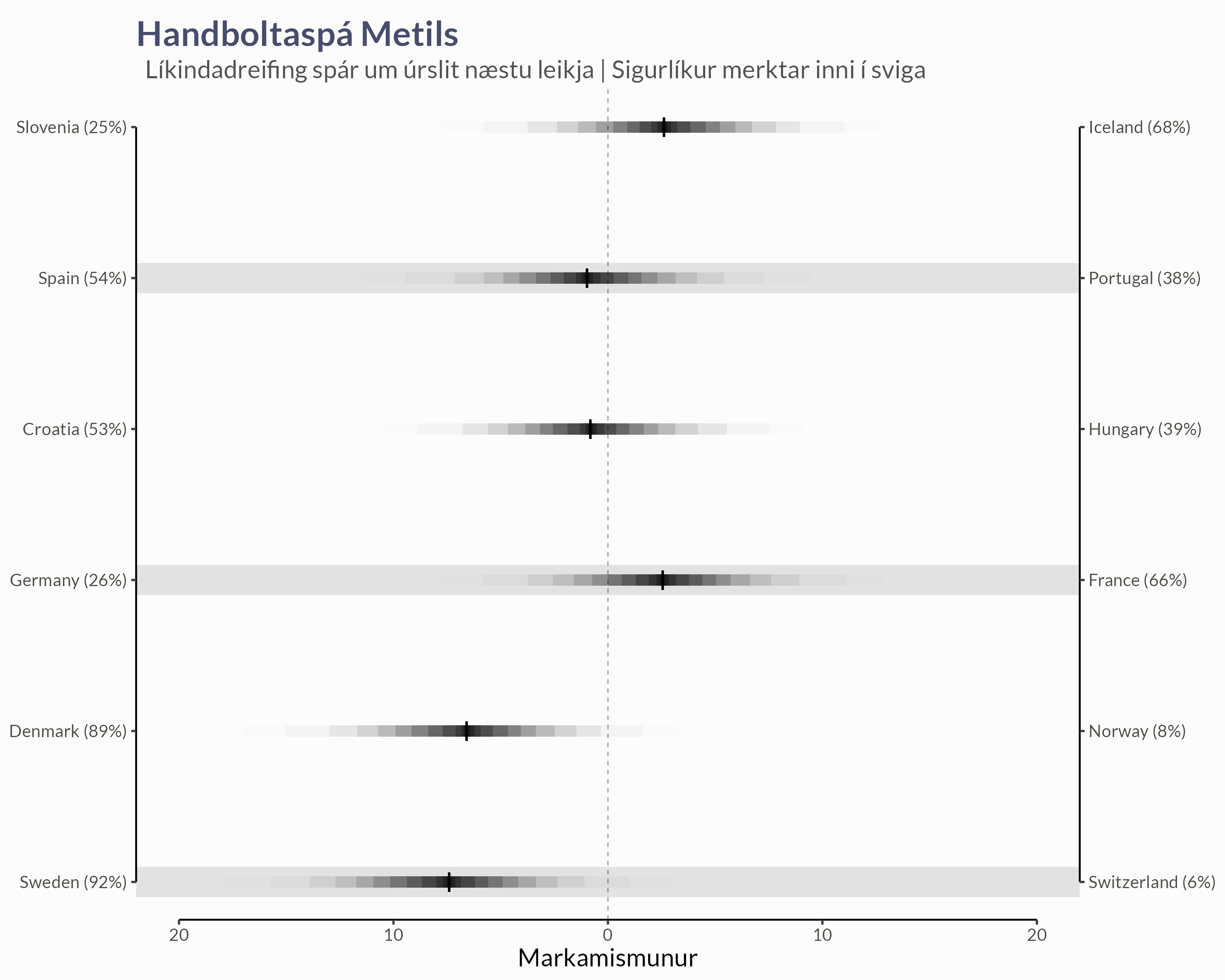 Fyrir áhugasöm birtir Metill núna tölfræðilega greiningu á frammistöðu landsliða sem keppa á EM í handbolta, en hún byggir á útvíkkun svonefnds Bradley-Terry líkans. Þetta líkan metur líkur á sigri milli liða út frá úrslitum keppna þeirra og gerir okkur kleift að bera saman getu ólíkra liða.