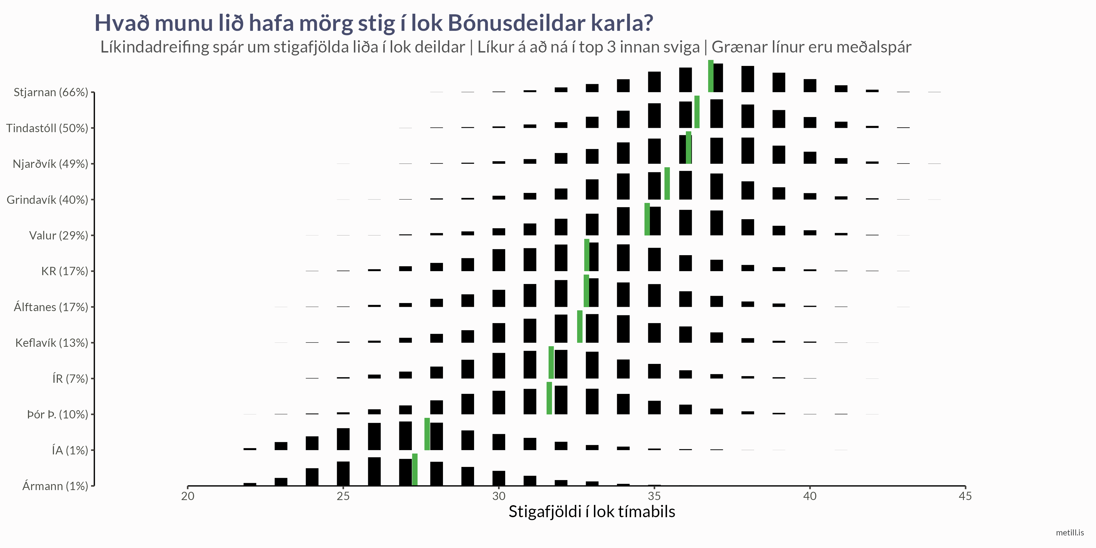 Við getum spáð fyrir um niðurstöðu allra leikja í deildinni og reiknað svo líkindadreifingu yfir stigafjölda hvers liðs í lok tímabilsins.
