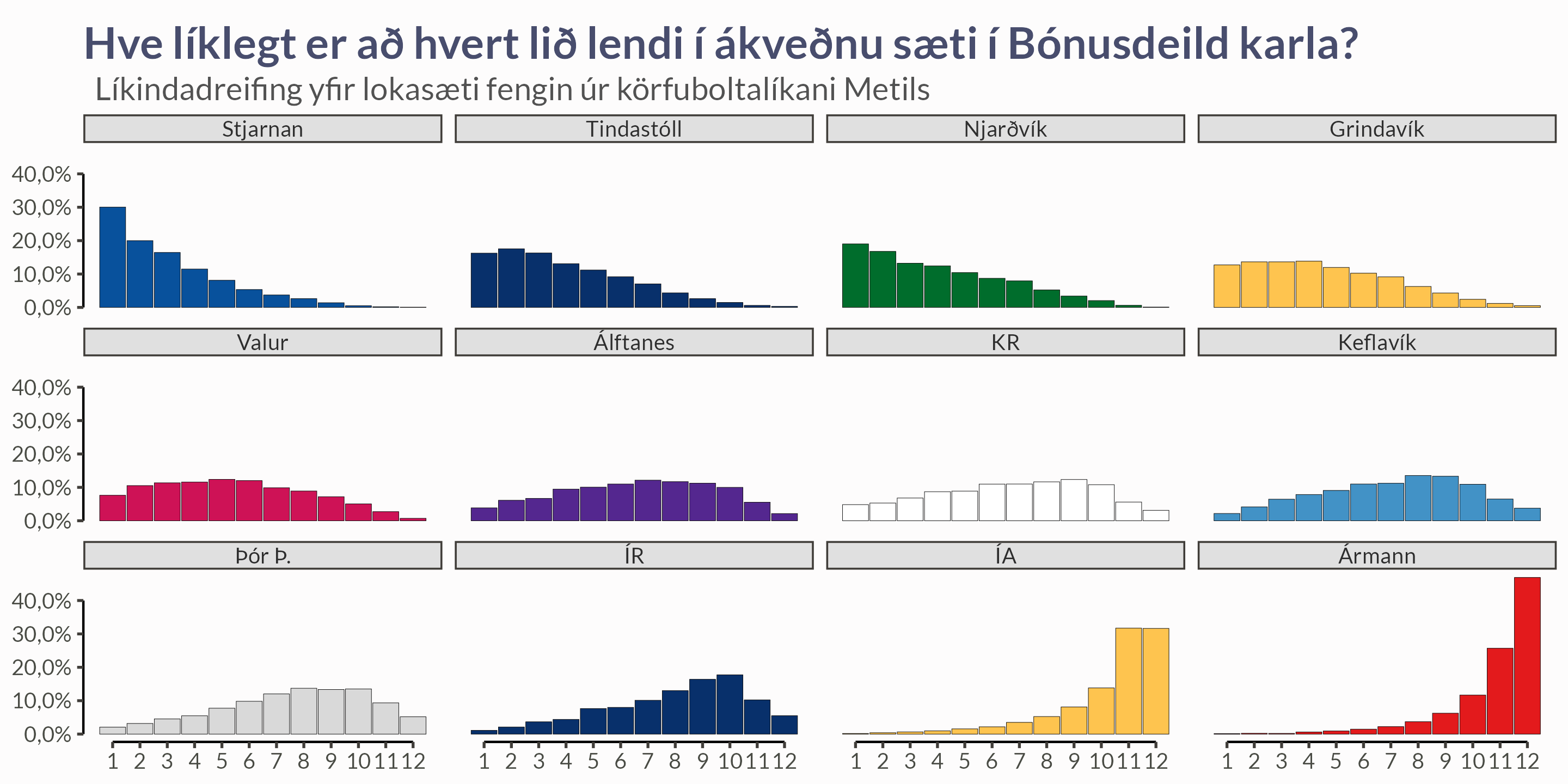 Við getum reiknað líkindadreifingu yfir sigurvegara tímabilsins.