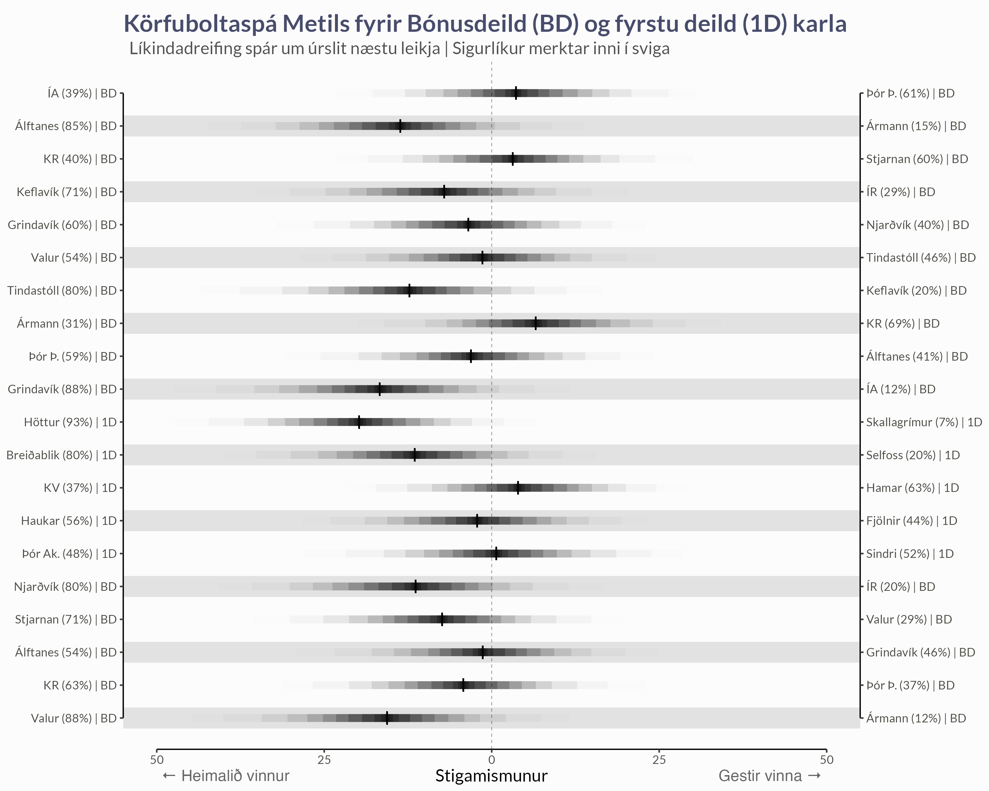 Spár um niðurstöðu leikja komandi viku má reikna úr líkindadreifingum sem líkanið metur.